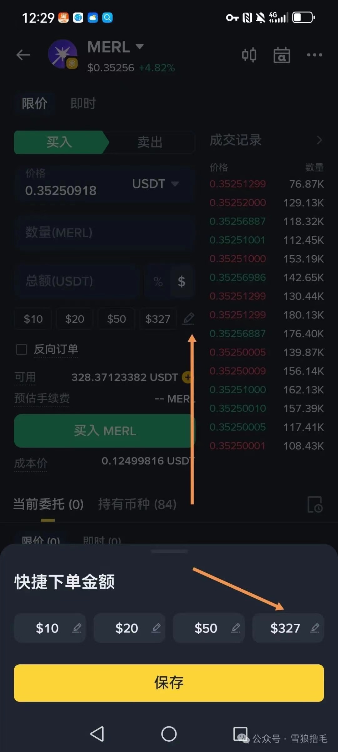 选择交易量大的,带4的(交易量按照实刷4倍算)点进去看下,k线走势平稳的去刷即可,我们以merl为例