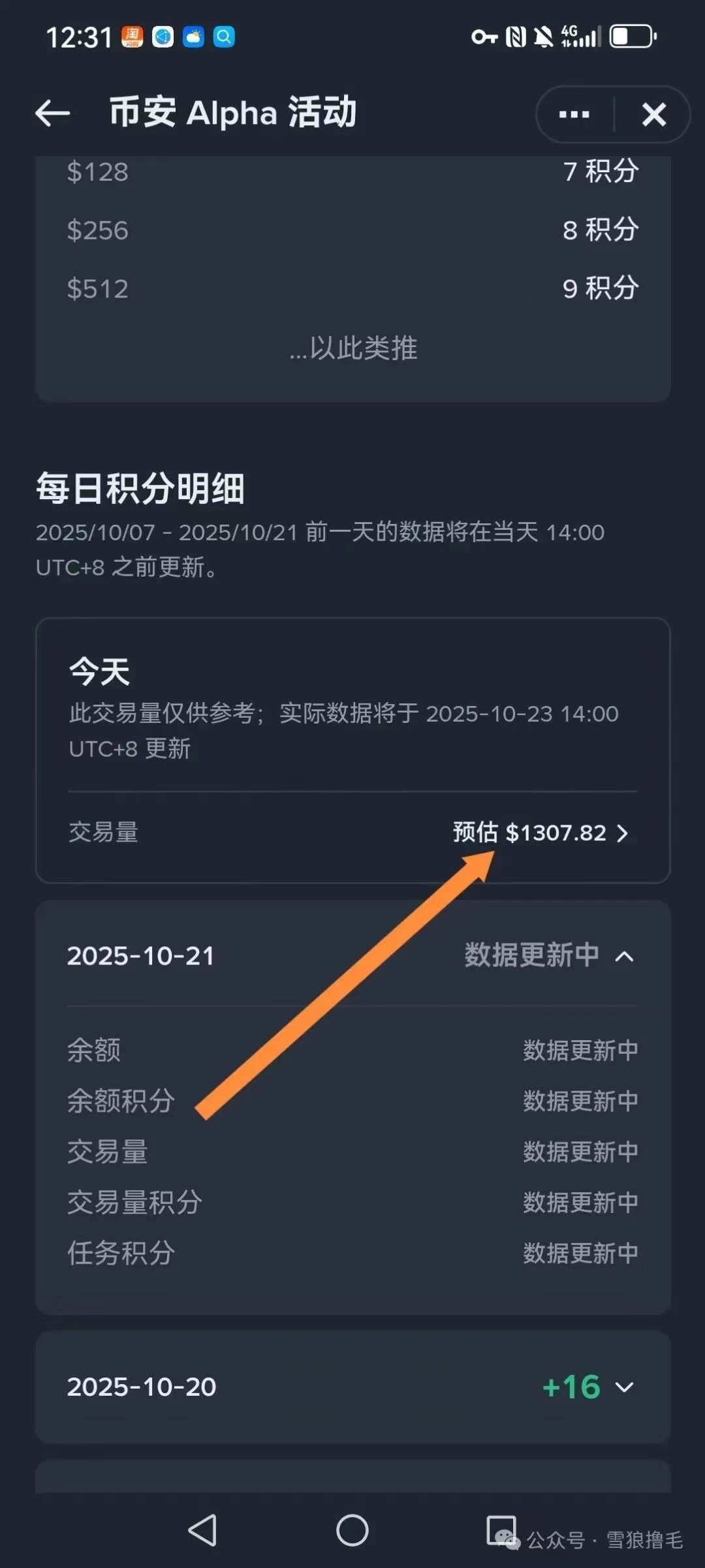 余额能拿几分,看你自己的实力,我们主要说说如何通过刷交易拿积分,上面的积分每天累加的,15天一个循环周期